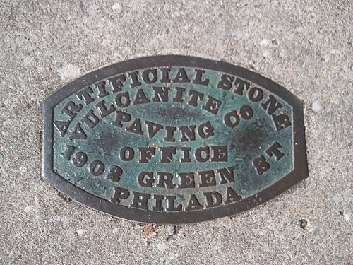 پلاکی که در بتونی یک پیاده رو در خیابان کلمبیا در کیپ می ، نیوجرسی ، ایالات متحده نصب شده است. روی آن نوشته شده است: "شرکت سنگفرش سنگ مصنوعی ولکانیت، دفتر 1902 گرین خیابان، فیلادا" [فیلادلفیا، پنسیلوانیا، ایالات متحده]. احتمالاً مربوط به اواخر قرن 19 یا اوایل قرن 20 است. (بتنی که در حال حاضر آن را احاطه کرده است، پیاده رو اصلی نیست.)
